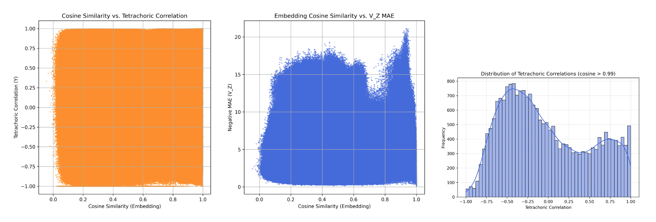 there is no consistent relationship between these two measures — even when \(\cos(E_i, E_j) > 0.99\),