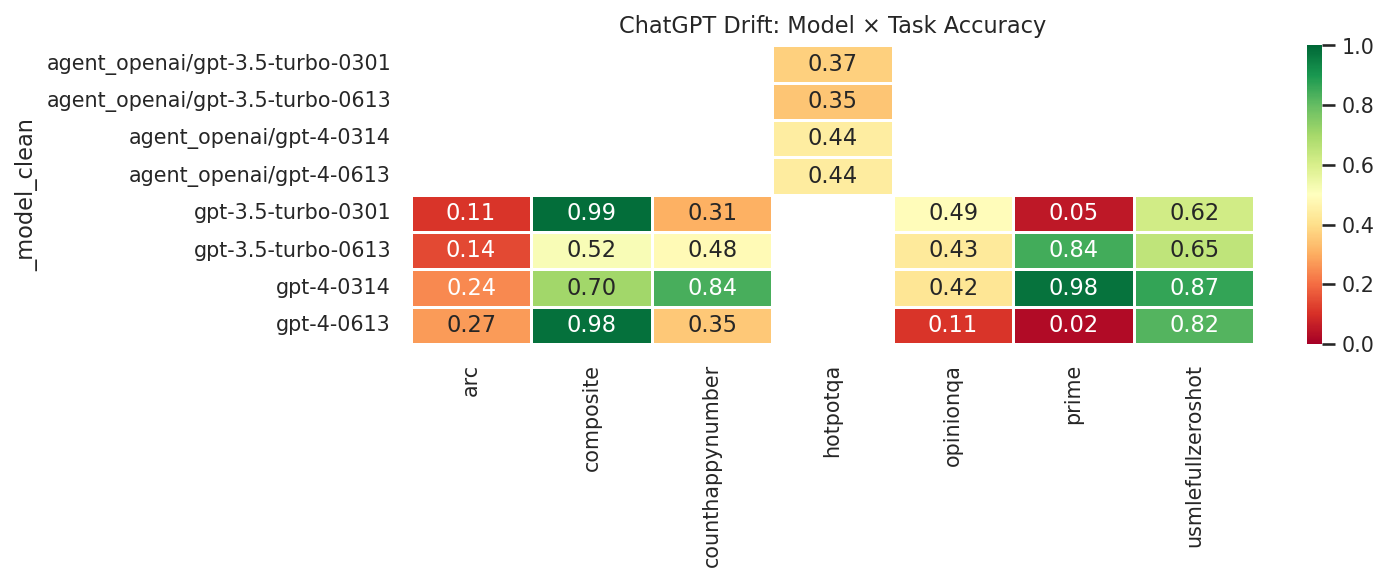 Post-deployment monitoring. Pre-deployment benchmarks measure what a model can do; post-deployment monitoring measures what it does do in production. Several structured data sources are emerging. Incident databases — the AI Incident Database (AIID, 1,404 incidents with CSET harm taxonomy), the OECD AI Incidents Monitor (14,000+ incidents), and the MIT AI Risk Repository (1,700 risk entries from 74 frameworks) — catalog real-world AI failures, though their observational structure (incident logs, not standardized item banks) does not map cleanly to response matrices. Production interaction logs offer richer measurement opportunities: WildChat (4.8M real ChatGPT conversations with per-message moderation flags) and LMSYS ToxicChat (10K labeled production prompts) effectively provide conversation × safety-category binary matrices from deployed systems. NVIDIA Aegis 2.0 (33K interactions × 23 hazard categories) provides a similar structure. Regulatory monitoring data — notably the NHTSA Standing General Order crash reports (1,700+ self-driving incidents as downloadable CSVs) and California DMV autonomous vehicle disengagement reports (15,000+ disengagements by manufacturer) — provides the most structured post-deployment data, with natural cross-tabulations (manufacturer × incident-type) that function as response matrices. Finally, model drift studies — most notably Chen, Zaharia, and Zou’s documentation of GPT-4 accuracy dropping from 84% to 51% on certain tasks within three months — reveal that the response matrix itself is not stationary: the same model × item pair can produce different responses over time, violating the IRT assumption that ability parameters are fixed.